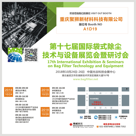 重慶聚獅科技將于2018年10月24日-26日參加在武漢光谷科技會展中心舉辦的第十七屆國際袋式除塵技術與設備展覽會,展臺號為:A1D19,誠摯邀請并歡迎蒞臨聚獅展臺洽談。