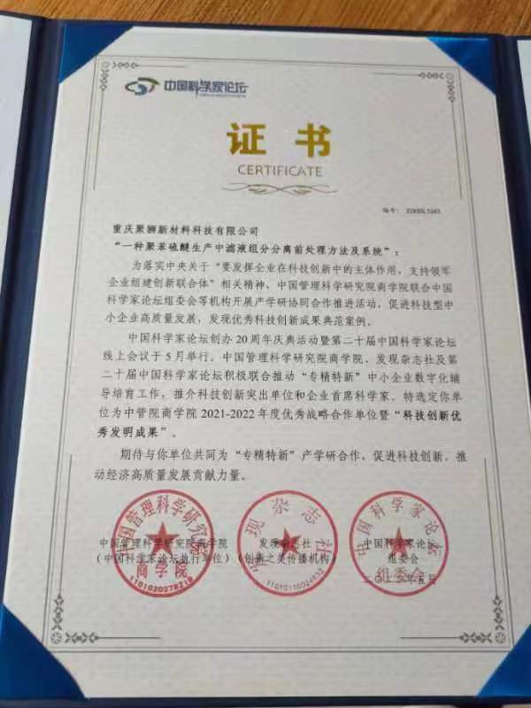 論壇組委會對重慶聚獅新材料科技有限公司(以下簡稱“聚獅新材料”)在技術研發領域敢于探索、勇于創新,在推動科技自強自立、行業發展、技術創新方面做出的突出貢獻表示肯定和欣賞,選定聚獅新材料為中國管理科學研究院商學院2021-2022年度優秀戰略合作單位暨“科技創新突出單位”,并授予聚獅新材料的“一種聚苯硫醚生產中濾液組分分離前處理方法及系統”專利 “科技創新優秀發明成果”。